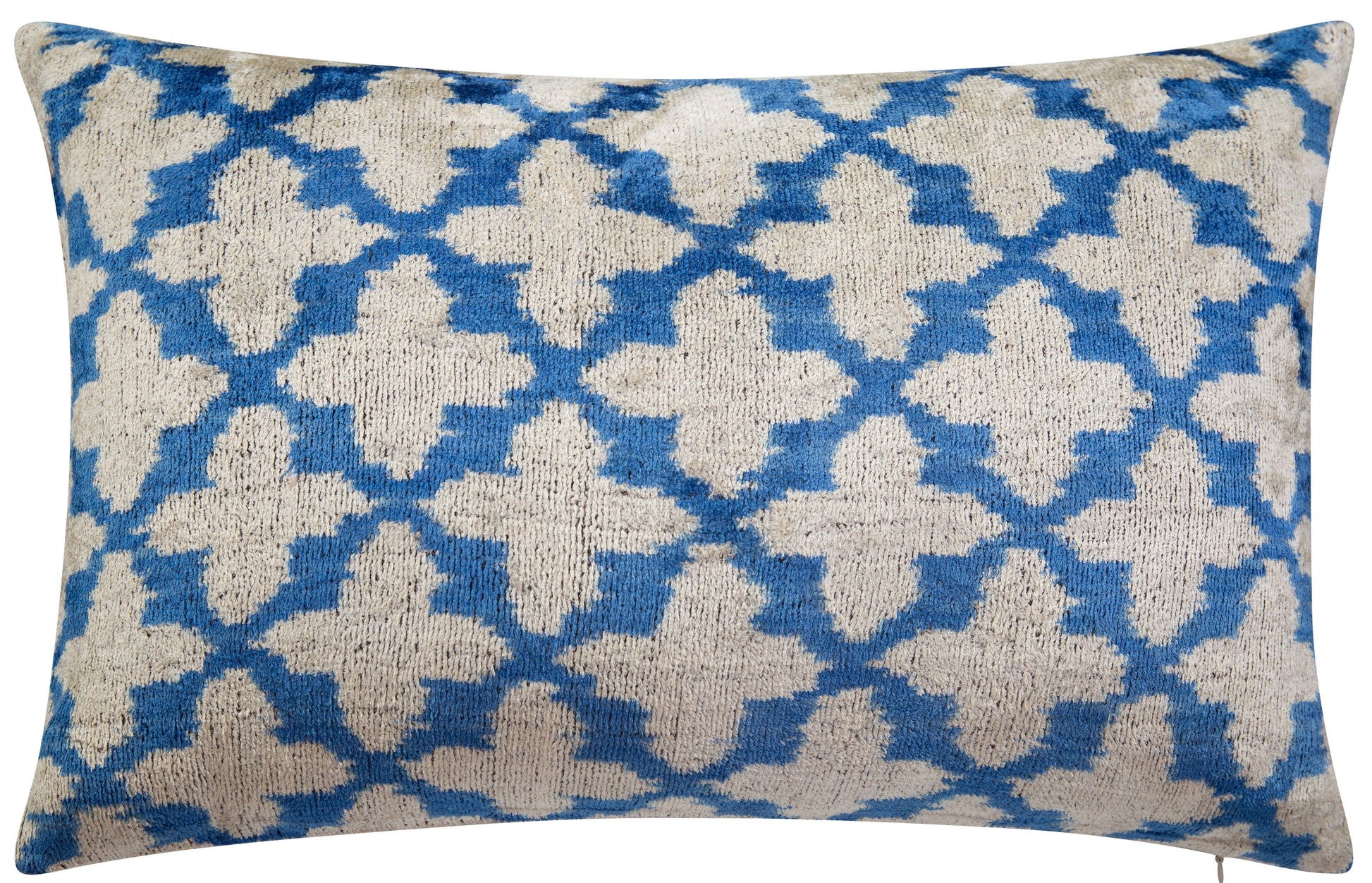 Handcrafted velvet cushion featuring a striking Moroccan trellis pattern in blue and beige. Made with organic vegetable dyes and filled with premium down feathers for ultimate comfort. At 16x24 inches, it's the perfect size to elevate sofas, chairs, or beds with a touch of bohemian elegance. Durable silk velvet construction ensures this beauty lasts for years to come.